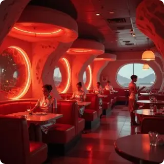 Nestled between a taco joint and a vintage prop shop, Red Dunes Eatery brings a taste of Mars to Burbank — and somehow makes it feel right at home. The décor is a clever blend of retro sci-fi and desert minimalism: glowing red lighting, crater-shaped booths, and servers in shimmering silver aprons. But the real spectacle is the food.