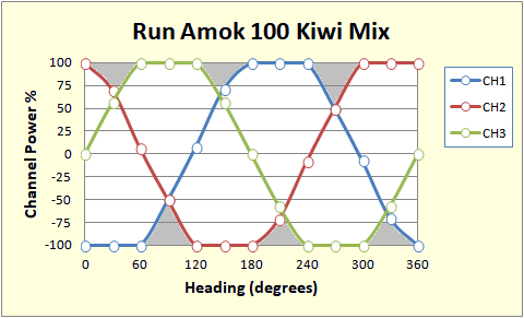 Correct mix weights will be either 100% or The images below graphically show the percentage of available power applied to each of the three motors throughout the full range of non-rotational holonomic motion. An efficient mix will have less 'grey' underpowered area in their graph, and the grey areas will be triangular.