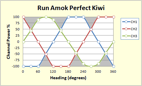 Experimentally minded builders may wish to play with the Desmos Kiwi Drive Calculator. BONUS: Someone will eventually point out that my Kiwi mixes for CH1 and CH2 are "non-linear" and that for perfect Kiwi control they should be "linear". Yes, although my Kiwi 100 mix is efficient it imperfectly fits the "ideal" Kiwi control profile -- off by as much as 9% in places. I doubt you'd ever notice this disparity in the real world, but to head-off complaints from perfectionists I assembled a version of the mix that incorporates a set of six custom curves to warp all three Kiwi control channels into their correct shapes.