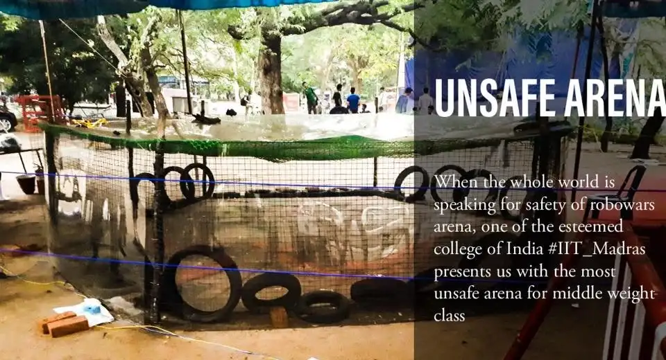 Further, I have seen videos of recent Tunisian robot combat (see image below). Wire mesh is wildly inadequate for the safety of the competitors and spectators. Combat robots of this size and power require a much higher standard to protect human life and limb from potentially deadly shrapenel. My conscience does not allow me to assist in creating faster or more powerful robots for use under such conditions.