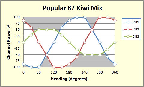 Correct mix weights will be either 100% or The images below graphically show the percentage of available power applied to each of the three motors throughout the full range of non-rotational holonomic motion. An efficient mix will have less 'grey' underpowered area in their graph, and the grey areas will be triangular. ![]() ![]() Experimentally minded builders may wish to play with the Desmos Kiwi Drive Calculator. BONUS: Someone will eventually point out that my Kiwi mixes for CH1 and CH2 are "non-linear" and that for perfect Kiwi control they should be "linear". Yes, although my Kiwi 100 mix is efficient it imperfectly fits the "ideal" Kiwi control profile -- off by as much as 9% in places. I doubt you'd ever notice this disparity in the real world, but to head-off complaints from perfectionists I assembled a version of the mix that incorporates a set of six custom curves to warp all three Kiwi control channels into their correct shapes. ![]() I personally wouldn't bother. Q: Will you please walk me through how the mix works? I'd like to know how to modify it for a non standard design. What changes if the wheels aren't set 120° apart? What changes if the wheels aren't equidistant? A: Sure. Using the convention from the stackoverflow.com discussion, where a '+' value spins the motor clockwise and a '-' value spins the motor counter-clockwise: