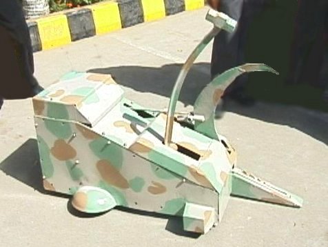 From: Zia KhanI don't know what became of their 'Badar 1' robot, or if they ever succeded in staging a robot duel. I have reproduced the email with its two photos of Badar 1 below for posterity. It's an entertaining read. Date: Tue Mar 9, 2004 10:50 pm Subject: Badar I: First Remote Computer Control Combat Robot of Pakistan We are extremely proud to announce that Operation Badar engineers Mr. Shoaib and Mr. Adnan have been successful in building Pakistan's first remote and computer controlled combat robot. We are calling it Badar I. For the last 8 months they have been working extremely hard to achieve this objective. We beleave that Badar I is an international level combat robot, please be the judge (For comparison check out http://www.open.org/joerger/gallery.html for details on robots that appeared in Robotica -the TV program also seen on Discovery and Sports 10 cable channels in Pakistan). Badar I technical details are given below and more then a 100 pictures are available at: [site no longer available and not archived]. The pictures also cover the visit to Sir Syed University of the Robotic team, this is the first occasion that Badar I was show to the students last week. Tomorrow (Thursday, March 11) we will display the robot again at 12:30 pm in the University. The plan is to visit all the universities of Karachi and challenge them for a duel. Through out the world engineers and hobbyist have been building combat robots for fun as well as for learning electronics, mechanics, and computer science. We want to start this trend in Pakistan. But before we started classes in robotics we wanted to be sure that our team is able to build robots before teaching others. For the last three years we have tried to achieve this objective. We funded about 8 teams except for two teams all of them failed (Please don't ask me how much of OB's and my own money I have spent on this, it is sufficient to know that it is critical that in Pakistan that we start this trend). We are very proud that we did not get discouraged because of the failures, but marched on. The code name for this project was Operation Balakot, to remember Syed Ahmed Shaheed, I believe he is very proud us today, we never give up. The plan is to start a 6 month course in Practical Robotics in Sir Syed University of Engineering and Technology on the occasion of 23rd March, Insha Allah. Before that day we will hold a seminar. The classes will be held on Sundays only. You can call the university at 4800420-21 next week to get the rest of the details. All classes will be held in the labs, therefore the seats in this class will be extremely limited. The Operation Badar Practical Robotics team will consist of the following faculty: Mr. Shoaib (Designer and builder of Badar I)-Academic Coordinator Mr. Adnan (Designer and builder of Badar I) Mr. Arif (Designer and builder of RoboPak I) If you are interested in Robotics please join (I request you to congratulate Mr. Shoaib and his team for achieving for Pakistan you can call him at 0333-220-6875 or by emailing to the group) Badar I Details: Robot Name: Badar I (First International level combat robot in Pakistan) Made By: Mr. Adnan Ahmad and Mr. Shoaib Muneer Power source: 12 v 40 aa Battery Dimensions: Length 4.5 ft, Breadth: 1.3 ft, height 3.5 ft Weapons: Pneumatic Hammer (400 lbs of power) and Pneumatic Jaw (1200 lbs of power) Weapon Power System: Pneumatic and Mechanical Steering Motor: 90 watts Driving Motor: 200 watts Compressor: 200 watts (Compressed Air Source for Weapons) Jack Motor: 90 watts Lock and Unlock Motor: 5 watts Compressed Air Pressure Tank: 15 c.ft (Max Pressure: 700 lbs) Air control: Solenoid 12 volt Pneumatic Jacks for Hammer: 1.5 ft x 1.5” Pneumatic Jack for Jaw: 2 ft x 2.5” Release Bar: 0.5 ft x 1”